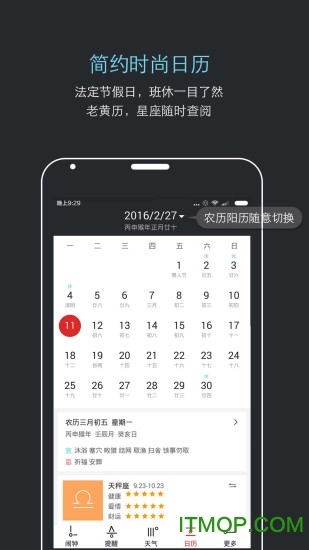 -简约时尚日历,法定节假日,班休一目了然,老黄历,星座随时查询,传统与现代完美结合。