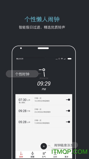 操作方便,准时提醒。个性的懒人模式,智能节假日过滤,起床困难户的福音。支持多种铃声选择和渐强音量设置,让您从美梦中自然醒来,开启活力满满的一天。