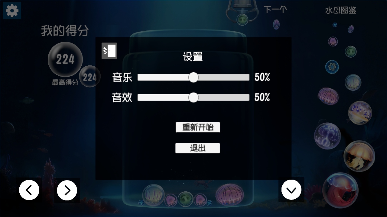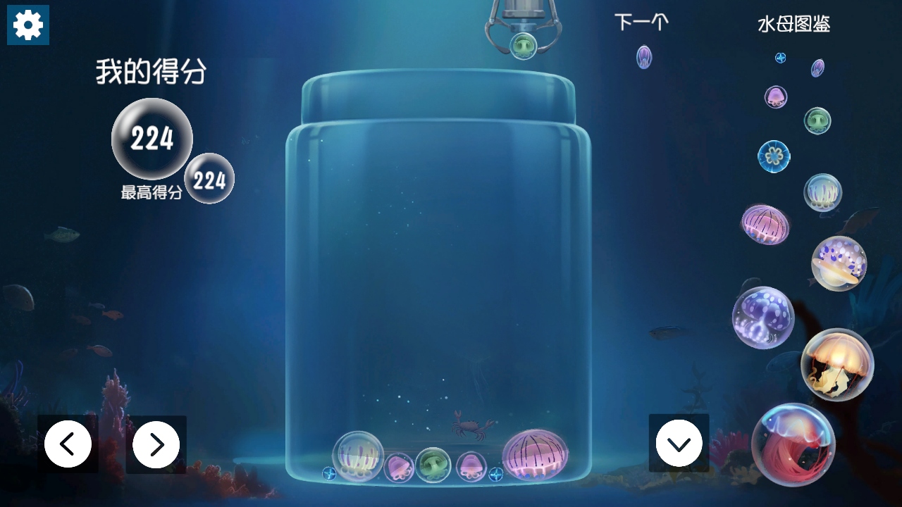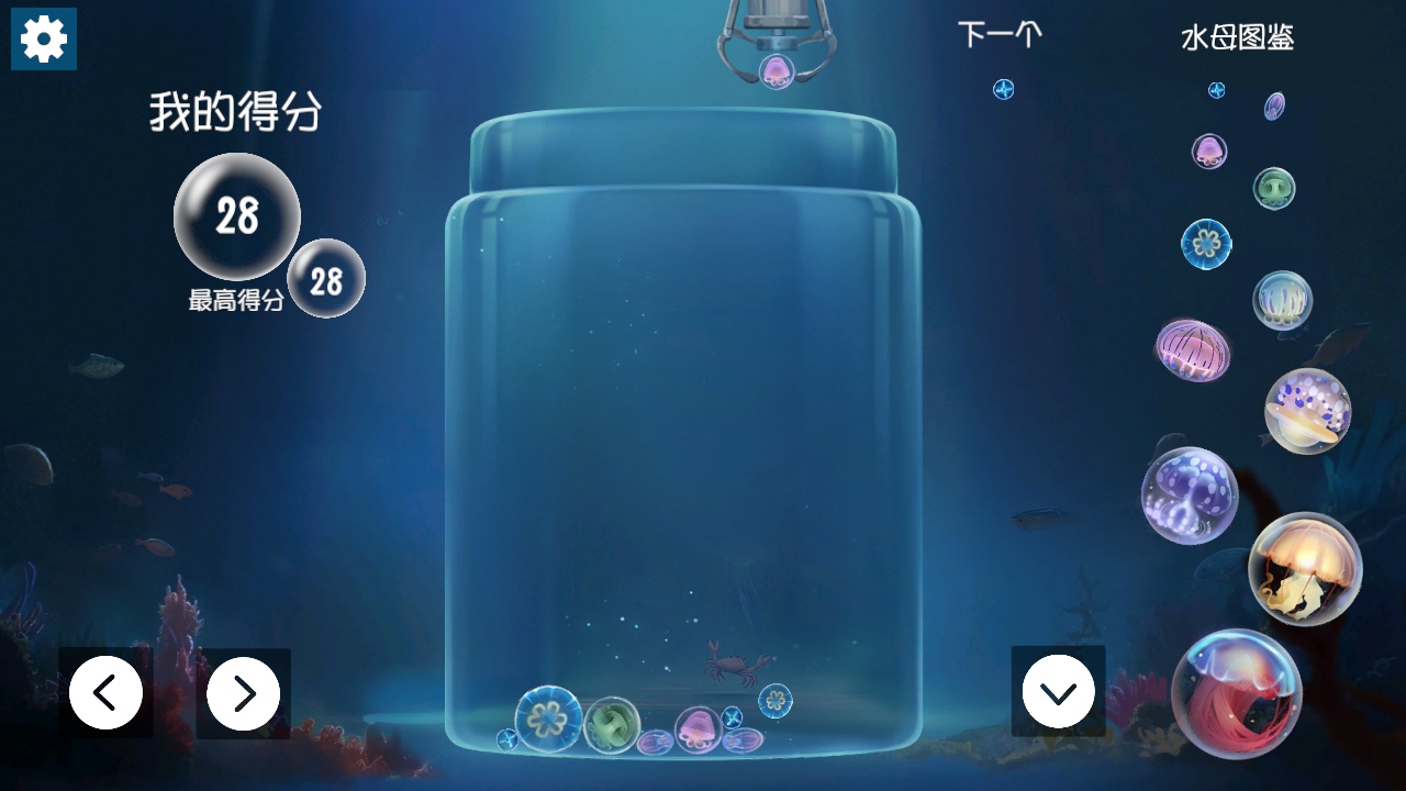 进入游戏后点击单人游戏即可开启冒险之旅。游戏提供了详细的新手引导,帮助玩家快速掌握操作要领。点击在瓶子中放入水母是游戏的第一步操作,系统会随机生成不同等级的水母。相同的水母可以合成更高阶的水母,每次成功合成都会获得分数奖励和视觉特效。我们可以不断的进行合成直到屏幕右边的水母图鉴合成最高阶的水母就算挑战成功了,过程中要注意控制水母的投放节奏,避免游戏区域过早被填满。