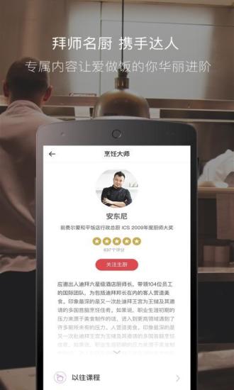 「烹饪课程」:线上达人直播、线下名厨授课,百位烹饪大师现场指导做菜。课程内容涵盖从入门到精通的各个阶段,无论你是想学习基础烹饪技巧,还是想提升专业厨艺,都能找到合适的课程。每月还会邀请米其林大厨开设特别课程。