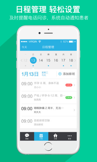 预约日程排班并提醒:智能日程管理系统会自动优化医生的工作安排,提前15分钟推送问诊提醒。系统支持多终端同步,医生可通过手机、平板或电脑随时查看当日诊疗安排。
