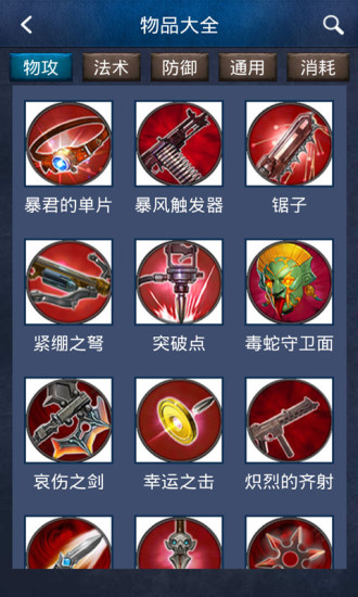完整收录游戏内所有装备的详细信息,包括价格、属性加成和适用场景。系统按照物理攻击、法术强度、通用装备和消耗品进行分类,方便玩家快速查找。每件装备都配有详细的使用说明和搭配建议,帮助玩家理解装备之间的协同效应。新增的装备模拟器功能,可以让你自由搭配测试不同出装方案的效果。