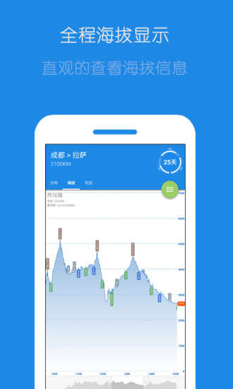 直观的海拔地图,以直观的判断路段的走势,支持3D地形展示和海拔变化曲线分析,帮助用户提前适应高原环境;