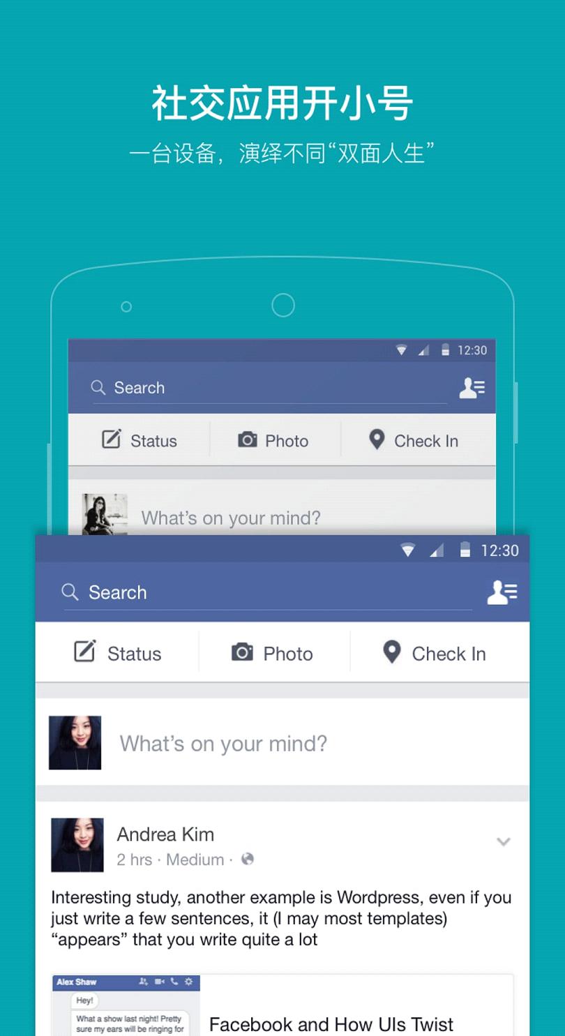 2Face开小号软件由猎豹移动(NYSE:CMCM)专业团队精心研发,是一款真正解决多账号管理难题的应用。你是否遇到过这样的困扰:玩游戏想开小号却只有一台手机?工作和生活需要两个微信号却无法同时在线?虽然手机支持双卡双待,却只能登录一个微信账号?有了2Face,这些烦恼都将成为过去!这款软件支持在微信、QQ、微博等主流社交平台同时登录多个账号,彻底释放你的小号需求。无论是微信、QQ这样的社交应用,还是列王的纷争等热门游戏,2Face都能完美支持多开功能。