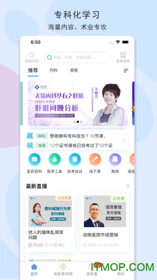 宠医大课堂:每月推出15+节名师直播课程,现有1400+节精品课程库,涵盖各类专业知识;同时提供大量5-10分钟微课程,满足碎片化学习需求。