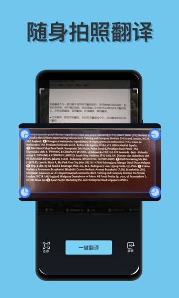 拍照翻译:快速识别图片文字,一键转换成译文;支持手写体识别,可准确翻译书籍、菜单、路牌等各种印刷或手写内容。