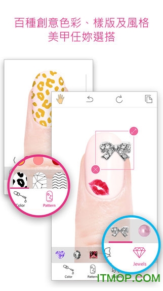 搭配新颖的印花纹路及指甲贴纸,或是变换你的美甲形状。每个元素都支持独立编辑,可精确调整位置大小,打造专属于您的独特风格。