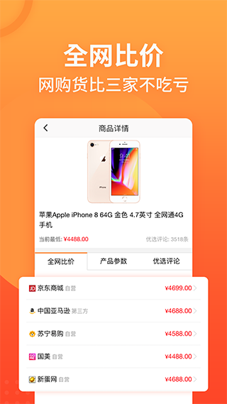 在网站内部立即开展价格对比,应用起来更便捷,操作界面简洁明了,比价结果一目了然。为您即时的消息推送各大网站的优惠折扣信息,包括限时秒杀、满减活动等超值优惠。全自动为您鉴别假营销和价钱信息,避免掉入商家先涨后降的促销陷阱。让您真实的购到廉价,保证购到物美价廉的商品,内置用户评价系统帮助您判断商品真实质量。