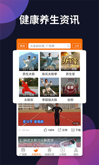 广场舞多多的内容丰富多彩,除了常规的广场舞教学外,还包括京剧、搞笑二人转、豫剧、曲剧等各种类型的戏曲表演,让用户在闲暇时观看,愉悦心情。软件特别整理了火爆的广场舞教学视频,涵盖真实健康舞蹈、烹饪主题舞蹈、戏曲风格舞蹈等,开启全民健康新模式。对于喜欢怀旧的用户,软件还收录了大量经典好听的戏曲红歌,让用户追忆岁月,聆听时间的沉淀。所有内容都支持一键下载,随时随地观看,即使没有网络也能享受精彩内容。此外,软件还提供科学实用的健康资讯,从饮食到运动,全方位指导健康生活。