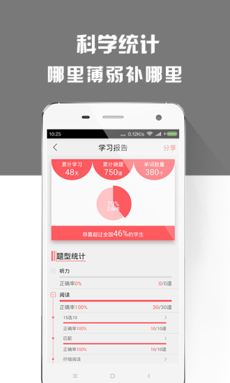 在线提问功能覆盖四级、六级及考研英语,专业教师团队承诺30分钟内响应,疑难问题可预约专家深度解答。单词记忆系统不仅包含标准发音和例句,还创新加入影视片段例句和词根动画,最近新增的AR单词实景功能让记忆更立体。真题库完整收录近15年考试原题,每道题配备视频解析和关联知识点图谱,支持按错误率智能组卷。视频课程包含200+小时名师录播课和每周直播特训,新增的AI学习助手能根据你的进度智能推荐课程。学习报告系统采用大数据分析,从答题速度、正确率等12个维度生成提升方案。