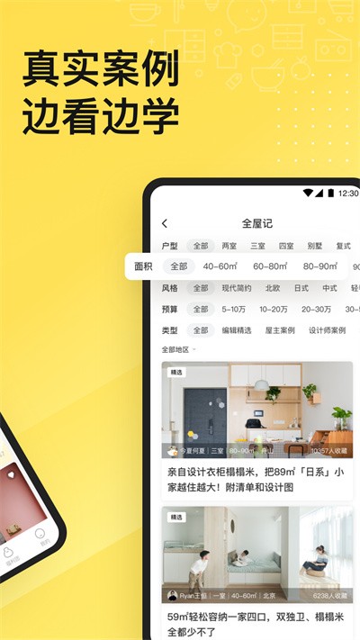 全屋记功能支持按地区和风格筛选案例,让用户能找到最适合自己的参考样板。看图功能提供多维度的筛选条件,帮助用户精准定位所需的家装图片。达人说汇集了众多装修达人的实战经验,为用户提供可靠的装修建议。找设计师功能让用户可以根据需求筛选合适的设计师,查看其作品集和用户评价。问题专区整理了用户常见的装修疑问,并提供专业解答。