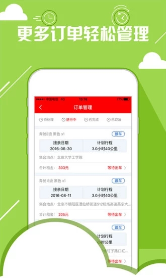 【抢单功能】平台每日发布大量优质婚车订单,车主可随时参与抢单,系统智能派单流程简单高效。租客需提前支付全款,平台提供完善的账户管理系统,让车主可以随时查看账单明细,实现轻松赚钱。