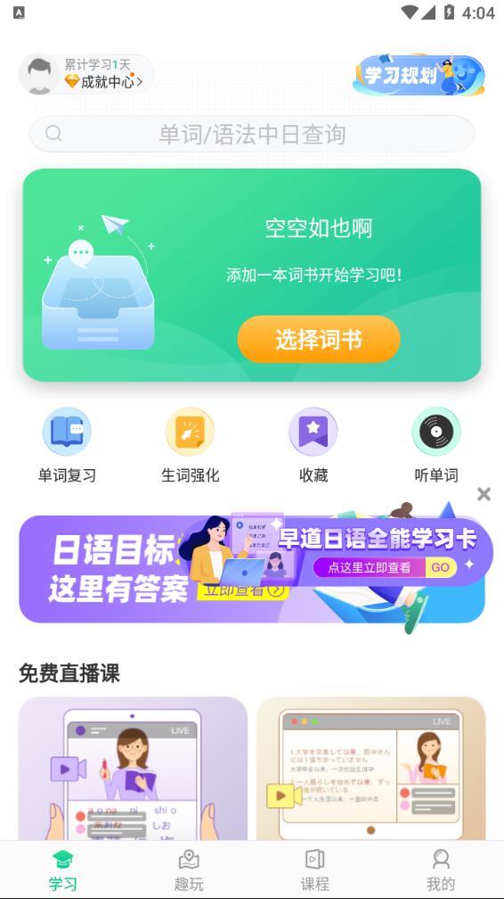 词书丰富,覆盖教材(新标准日本语、大家的日语...)、能力考(N5-、绿宝书...)、生活兴趣等多方面词书,满足你的各阶段日语学习需求。所有词库都经过专业团队精心筛选和分类,确保内容的权威性和实用性,让你可以针对性地选择最适合自己的学习材料。