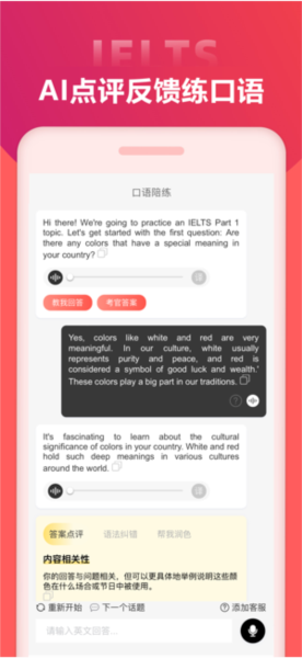 智能仿真对话:采用先进的语音识别技术,模拟真实对话场景,提供即时翻译和表达优化建议,帮助用户在基础版和高阶版练习中稳步提升0.5-1.0分。