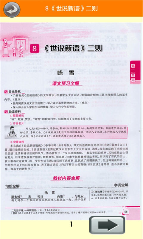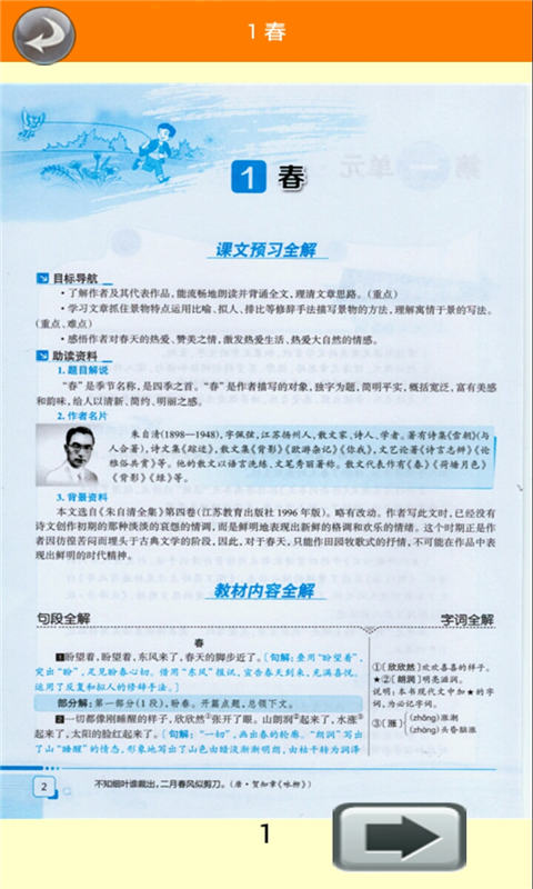 有高清的全彩电子课本(电子书),每页都配有高清的真人朗读,可重复播放,也可按次序播放;电子课本支持智能标注功能,学生可以在线做批注并云端同步。页面设计还原实体课本版式,同时增加了互动元素,点击生字即可显示笔顺动画和释义。