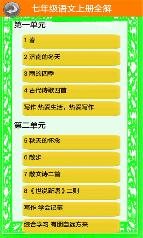 《七年级语文上册全解》是一款专为初中一年级学生设计的智能学习辅助软件,基于人教版教材深度开发。该应用通过数字化手段将传统语文课堂搬上移动终端,包含课文解析、词语详解、朗读训练等核心功能,采用互动式学习模式帮助学生突破学习难点。软件界面清新简洁,内容编排科学合理,既能满足日常预习复习需求,又能通过趣味学习方式提升学生的语文素养,是连接课堂与家庭学习的优质桥梁。