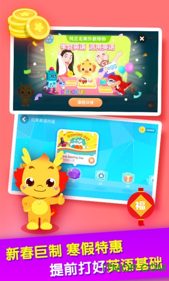 新春巨享,寒假特惠。节假日期间,推出不同学习礼包;新增春节主题课程,让孩子在学习英语的同时了解传统文化。