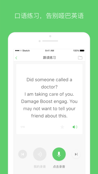 【练口语】内置智能语音评测系统,实时纠正发音错误,提供美音/英音双模式跟读,涵盖日常对话、学术讨论等多元场景。