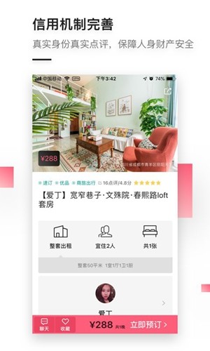 【千万入住用户好评】平台积累了千万用户的真实评价,帮助您快速了解房源详情、入住体验和房东服务,筛选更轻松,住的更舒心。
