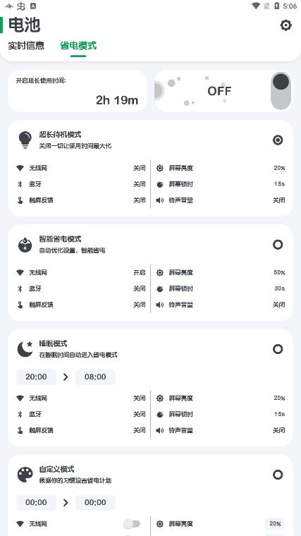 【省电模式】提供多种智能省电方案,用户可根据不同场景自由切换,操作界面简洁直观,轻松实现个性化电量管理。
