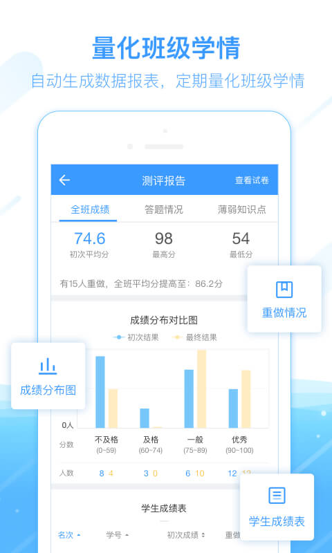 【有针对性的课堂测、单元测】系统采用先进的分析算法,能够对每份试卷的难度系数、区分度、平均分等多项指标进行专业评估。教师可以根据系统提供的分析报告,精准把握班级整体学习情况,有针对性地调整教学策略。同时,系统支持智能组卷功能,教师可以快速生成符合教学需求的测试卷。