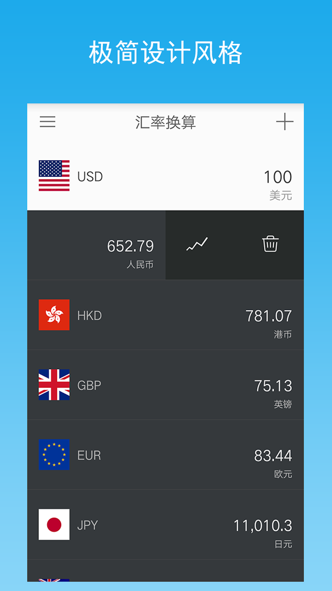 在货币列表上向左滑动可以删除不常用的货币,保持界面的整洁。