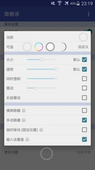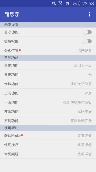 简悬浮Pro提供了全方位的快捷操作功能:包括返回键、主屏键、锁屏、下拉通知栏、查看最近任务等基础操作;支持自由移动按钮位置,方便不同使用习惯的用户;特有的切换上一个应用功能让多任务处理更加高效;内置的快捷操作面板集成了电源键长按、音量调节、响铃模式切换、Wifi/蓝牙控制、自动旋转、屏幕常亮等实用功能。对于Root用户,还额外提供锁屏、菜单键和关闭当前应用等高级功能,满足深度用户的需求。