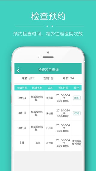 【检查预约】:线上预约各类检查项目,合理安排检查时间,避免现场排队等候,检查结果自动推送至手机;