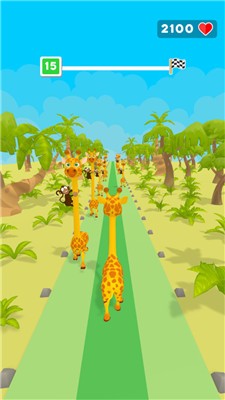 游戏的背景设定在大草原的春天,这正是年轻长颈鹿寻找伴侣的最佳时机。然而,求偶之路并非一帆风顺,玩家需要帮助长颈鹿克服重重障碍。游戏的核心目标很简单:收集尽可能多的长颈鹿之吻。每成功收集一个吻,就会有一群长颈鹿加入你的队伍,壮大你的求偶团队。操作方式也非常直观,只需在屏幕上左右滑动即可调整长颈鹿脖子的方向,长按屏幕则能让脖子伸得更远。随着队伍的壮大,玩家将面临更多有趣的挑战和惊喜。
