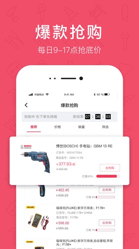 爆款抢购:每天9:00-17:00限时开抢,热门工业品低至1折起。