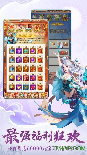 新服登录累计赠送【100000元宝】;首周即可获得孙悟空、二郎神、牛魔王等最强神将;还能免费领取如来佛祖、唐三藏、大鹏金翅雕等至尊红将。超强法宝如定海神针、哮天犬、芭蕉扇等7天即送,真正做到不花钱也能玩得爽快!