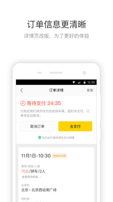 全新改版的订单详情页面让信息展示更加清晰直观,方便用户随时查看行程状态。平台优化了取消订单规则,引入手续费机制以保障司机权益。新增的预先支付保障服务和"确认到达"功能,让交易过程更加安全可靠。目前首单约车优惠活动正在进行中,新用户可享受专属福利。快巴出行将持续优化用户体验,为您提供更优质的城际出行服务。