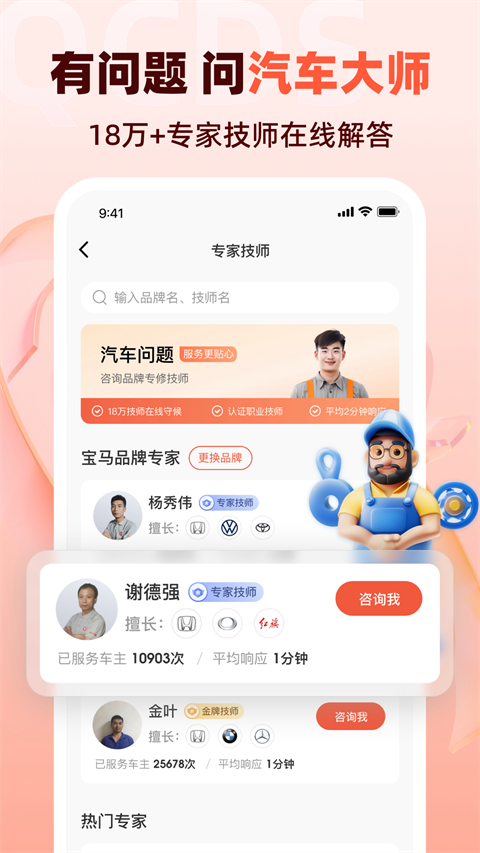 汽车大师app是一款专为车主打造的综合性汽车服务平台,集汽车问题解答、维修保养、配件上门安装等多项实用功能于一体。无论您遇到任何与汽车相关的疑难杂症,只需打开这款应用,10分钟内就能获得专业汽修技师的权威解答。平台汇聚了10万名经过严格认证的4S店资深技师(均具备5年以上从业经验),服务范围覆盖市面上100多个主流汽车品牌,真正实现"一机在手,养车无忧"的便捷体验。