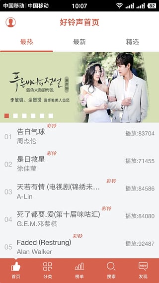 最精准分类:提供最热铃声、最搞怪铃声、影视歌曲等各种专业铃声分类,每个分类下还有细分标签,帮助用户快速定位目标内容。