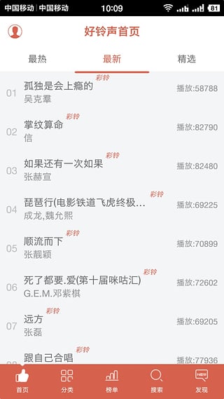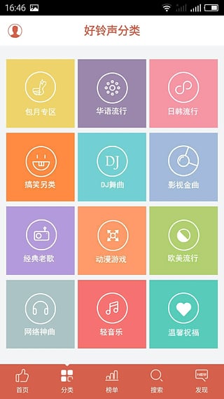 3、中国好铃声~分类多多;软件提供超过20种专业分类,包括流行金曲,影视热曲,动漫游戏,短信闹铃,DJ舞曲,搞笑另类,网络神曲等;曲库超全,每日新增1000+优质铃声资源,只要你想得到,在好铃声就能找得到,总有一款适合你。