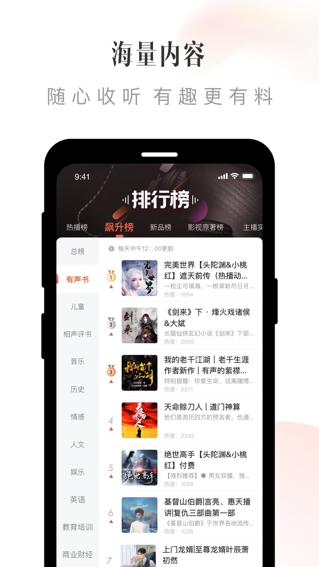 使用超级方便!支持wifi下在线收听和批量下载,智能算法会根据你的喜好推荐个性化内容。累计获得超过10万个5星好评,连续三年位列AppleStore图书榜首,充分证明了其卓越的用户体验。万千主播称赞:超级好用的音频自媒体平台!操作简单直观,拿起手机就可以录制节目,让亿万听众收听你的声音。平台还提供详细的数据分析功能,帮助主播更好地了解听众需求。
