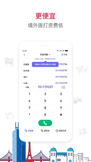 [国际通话]这项功能彻底解决了出境旅行时的通讯难题。您可以在225+目的地免费接听来电,国际拨打资费最低仅需0.08元/分钟。新用户注册即可获赠300分钟全球通话时长(限境外使用),让您与家人、客户保持畅通联系。