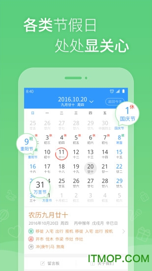 各类节假日,处处显关心。自动同步国家法定节假日,并支持自定义节日提醒,让您不错过每一个重要日子。