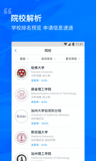 美英加澳大学/世界大学排名/录取条件/申请材料等,选校帝app里统统都有!平台支持多维度筛选功能,用户可按录取率、地理位置、专业实力等条件精准查找目标院校。