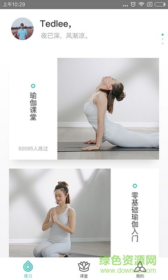 瑜伽课程分为3套,共计16节课程,涵盖流瑜伽、阴瑜伽、力量瑜伽等多种流派,每节课都配有音乐伴奏和语音引导。