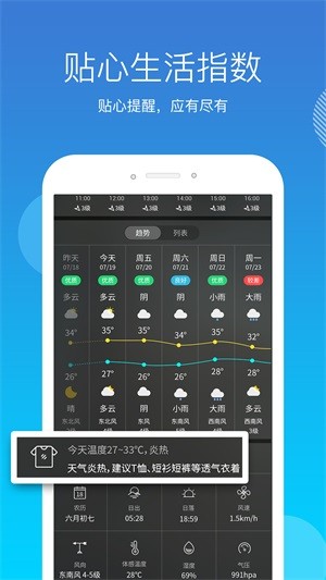 《天气吧》拥有多项独特功能,让你随时掌握天气动态。软件会实时推送最新的天气情况,确保你第一时间了解天气变化。其天气预报系统非常精准,不仅能提供当天的详细天气信息,还能预测未来30天的天气趋势,帮助你提前做好规划。软件内置的生活小提示功能特别贴心,会根据天气状况给出相应的生活建议。最值得一提的是其高精度的GPS定位系统,可以精确到街道级别的天气预报,确保你获取的天气信息与所在位置完全匹配。