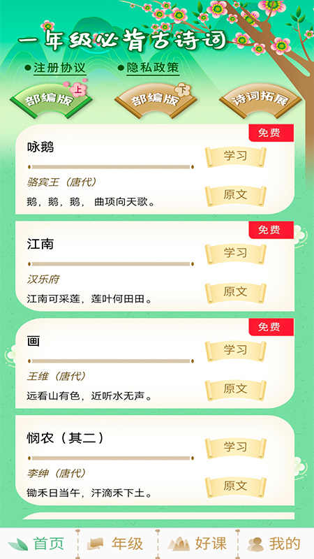 同步教材古诗文:完美匹配小学语文教材,按年级分类整理所有必背古诗词,方便孩子预习复习。
