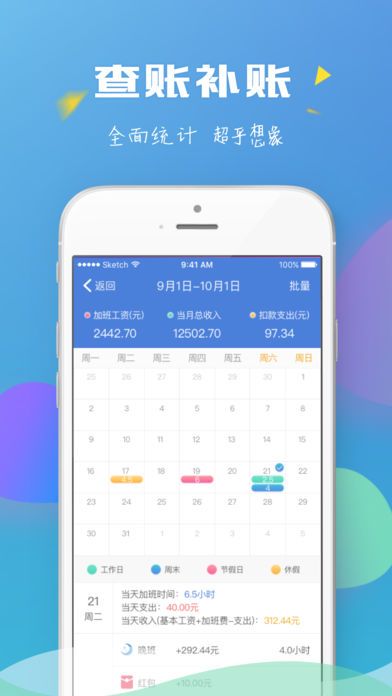 软件还提供完善的请假记账功能,可以详细记录各种类型的请假情况,包括病假、调休、带薪休假、轮休等特殊考勤状态。同时支持红包、奖金等额外收入的记录,确保您的每一笔收入都不会遗漏。