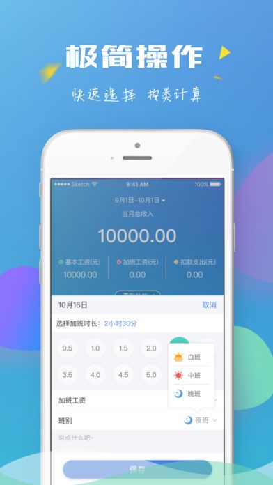 口袋加班拥有多项实用功能,首先是快速记录加班时长,系统支持记录每月基本工资,并能根据不同排班安排自动计算三档不同的加班薪资标准。无论是工作日加班、周末加班还是法定节假日加班,都能准确区分并按照对应标准计算报酬。