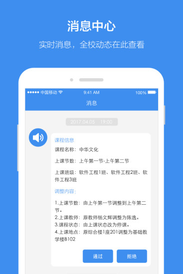 学生可以根据自己情况实时查看课表,教师可以进行调换课程。系统提供个性化课表定制功能,支持课程提醒、空教室查询等实用服务。教师端还具备课程冲突检测功能,确保调课操作的合理性。
