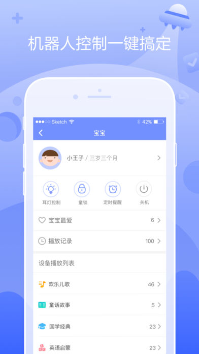 机器人控制一键搞定:通过app按键控制机器人的音量、耳灯开关,定时提醒,合理安排宝宝作息等。家长可以远程设置使用时长,避免孩子过度使用,保护视力健康,培养良好的生活习惯。