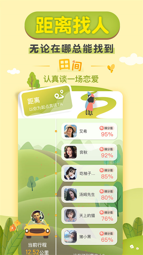 【距离】同城在线找对象、交友约会约聊平台专为单身汪打造的脱单密器。精准定位系统可以显示1公里内的优质用户,随时发起约会邀请,让缘分不再受距离限制。