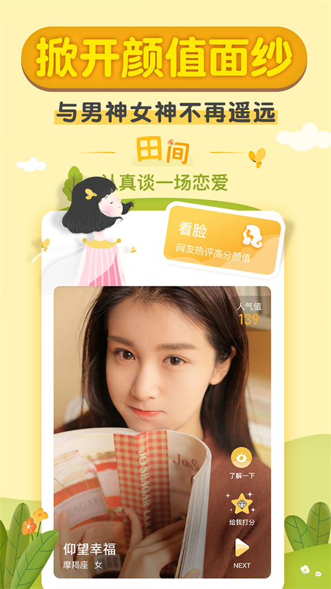 【看脸】零距离接触帅哥美女,成熟男女交友平台,联系心仪的单身异性,并且可查看近在身边可约会、可聊天、可约会、可面对面约聊的单身异性。高清照片墙展示,让你直观了解对方的颜值和气质,找到真正让你心动的那个TA。