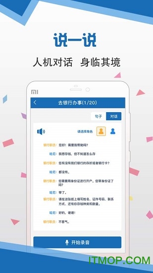 真实的生活场景,让你在学习中体验生活的乐趣!选择你感兴趣的日常生活场景,学习对应场景的常用语句和对话,在标准音的带读下学习发音并进行朗读练习,系统会自动评测你的声音,助你多次练习直至完美。场景覆盖购物、就医、交通等各个方面,每个场景都配有生动的插图和实用的对话范例。用户还可以录制自己的发音与标准音对比,直观了解发音差异。
