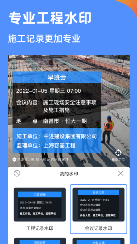 【专业的水印模板】鱼泡相机提供多种专业水印模板,包括考勤打卡水印、工程水印、工作记录水印、疫情防控水印以及时间地址水印等,满足不同场景的使用需求。